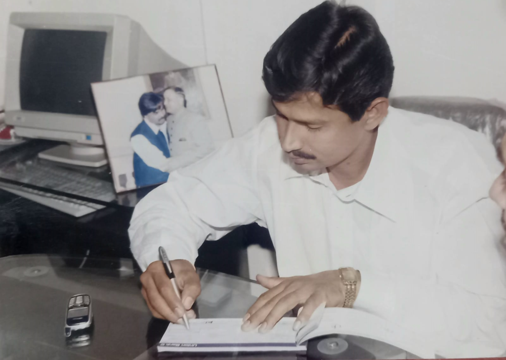ممتاز شفیق امدادی چیک پر دستخط کرتے ہوئے